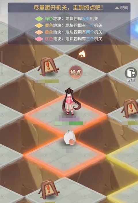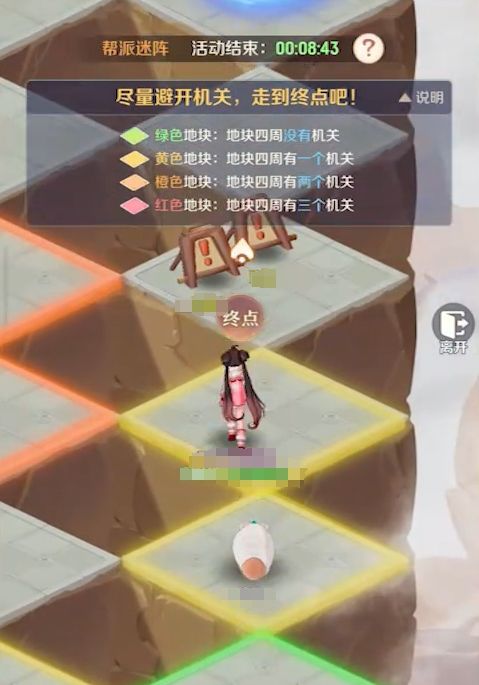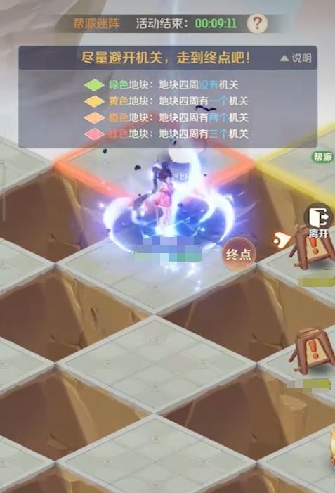 帮派迷阵是限时开放的玩法,它只在每周一、三、五、日的12点和18点开放,其模式与扫雷很相像,需要人们根据地面上各格子的颜色来进行解谜,找出一条安全的线路前往终点。不同颜色的格子所代表的含义完全不一样,其中绿色格子表示周边格子都为安全格,没有任何的机关,黄色则代表周边有一个,橙色则是有两个,红色则说明周边有三个格子存在的机关。要注意,每个格子都只与四个格子接壤,所以玩家在踩到红色格子时,最好原路退回,不要再继续前进,否则必定会触发机关。