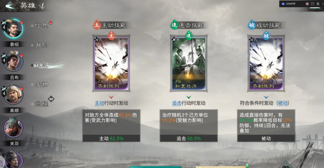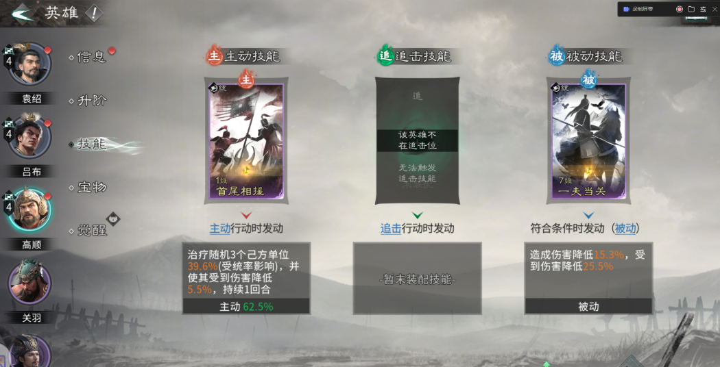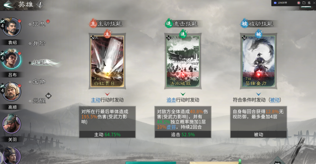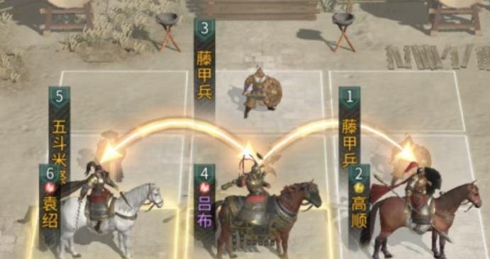技能搭配千万别乱带,带错了效果差很多。高顺的被动一定要带一夫当关,虽然牺牲了输出但是特别硬,让他能站得住脚,主动技能可以选首尾相援来回血减伤,保证他不倒下。吕布的主动技能固定带白虹贯日,专门盯着对面后排脆皮打,追击技能带决水破敌,能挂虚弱状态压对面血量,被动选层锋叠刃来叠加无视防御的效果,打到后面越打越疼。袁绍的主动和被动都推荐带齐射阵列,压血线的同时还能破防,追击技能选和衷共济来给队友加血,充当半个奶妈。