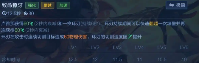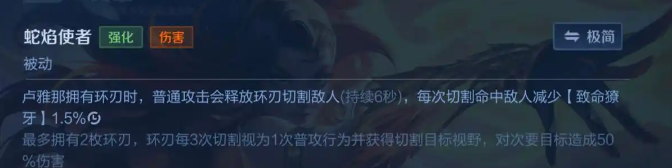 卢雅那拥有环刃时,普攻会释放环刃攻击敌方,提升输出伤害。每次命中会减少1技能【致命獠牙】1.5%的冷却,每3次切割伤害视为一次普攻行为且获得视野,对次要目标还会造成50%伤害。被动主要提升卢雅那伤害和为一技能减少冷却。