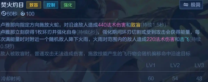 释放大招后立即获得一枚环刃和强化自身,期间强化环刃和受到攻击获得能力,满能力则对附近随机一个敌人降下火雨,造成伤害和击飞,是卢雅那唯一的硬控技能。大招是卢雅那的玩法核心,致盲不管是对线和打团都有非常好的效果。