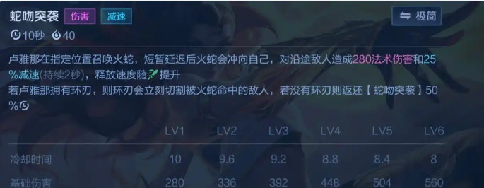 卢雅那向指定方向释放火蛇,对沿途敌方造成伤害和1.5秒致盲。致盲效果下敌方的普攻攻击无法造成伤害,释放技能产生的飞行物将随机偏移命中沿途目标,射手对拼时卢雅那有着绝对的优势。