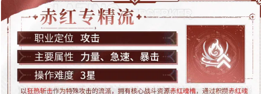 赤红专精流的定位是攻击,主要需要的属性有三个,分别是力量和急速以及暴击,力量大家都懂,就是为了增加基础的伤害,急速对于狂战士来说很重要,因为攻击频率高了攒能量才快,暴击则是为了让伤害数字更好看,操作难度大概在三星左右,不算特别难,但也需要稍微练习一下。
