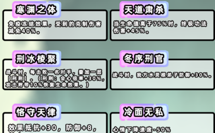 资质进攻端,大招伤害加成45%,击杀敌方弟子后叠加会心倍率和吸血效果。但玄冥神识低、大招系数也不占优势,基础会心又不足,每层刑荆实际带来的增伤连10%都不到,指望玄冥输出不太现实。防御端受克制伤害减免40%,全队水灵根防御加30%,听起来不错,但土灵根输出少,防御减伤在这个游戏里效果本来就被玩家质疑,实际感受比较平淡。玄冥自带30点抵抗且免疫冻结,上场被控的概率低一些,这点算是小优势。