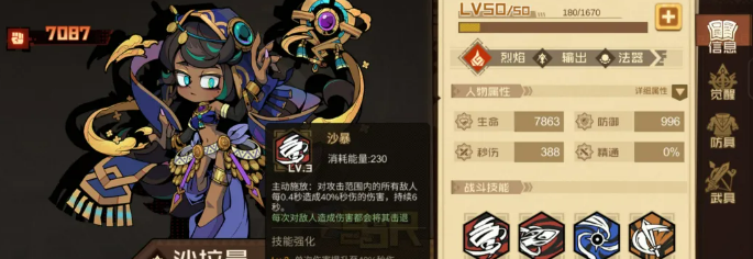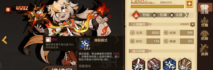 薇薇安在这套阵容里定位是副输出。她的被动可以缩短自动技能的冷却时间,让自动技能的释放频率更高。而她的自动技能爆裂模式,可以给敌人挂上燃烧状态,而且有三段伤害,每段都能触发天罚之日的增益,同时也触发自身被动的减冷却效果。燃烧挂上去之后,沙拉曼的沙暴伤害会更高,两个角色之间的联动就是靠这条线串起来的。