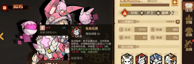 诺儿适合对抗那种集中爆发的BOSS关卡。她的大招有4秒无敌效果,可以直接无伤接下BOSS的高爆发技能,自保能力在护卫里算很突出的。她的自动技能还带破甲,打强力单体BOSS的时候破甲效果很有用。诺儿需要多堆充能速度,方便手动卡时机释放大招来挡关键伤害。