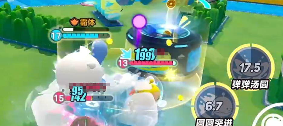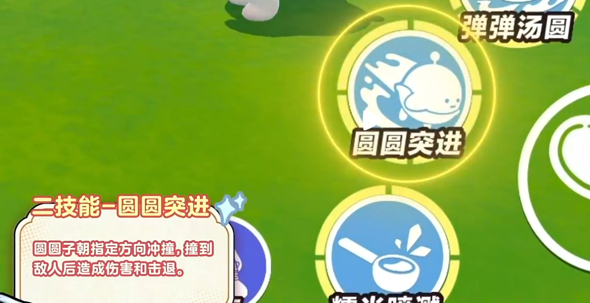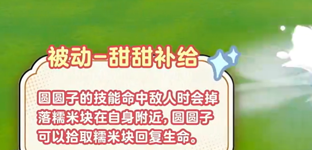 先说圆圆子的被动,叫甜甜补给。这个机制比较特别,技能打到敌人之后,会在自身附近掉落糯米块,然后圆圆子可以捡起来回血。也就是说,只要技能持续打到人,就能一边打一边补血,续航能力很强。更有意思的是,圆圆子的血量越高,体型就越大,技能的覆盖范围也会跟着变大。所以保持高血量不只是为了活得久,还能让技能打出更大的效果,两件事是连在一起的。