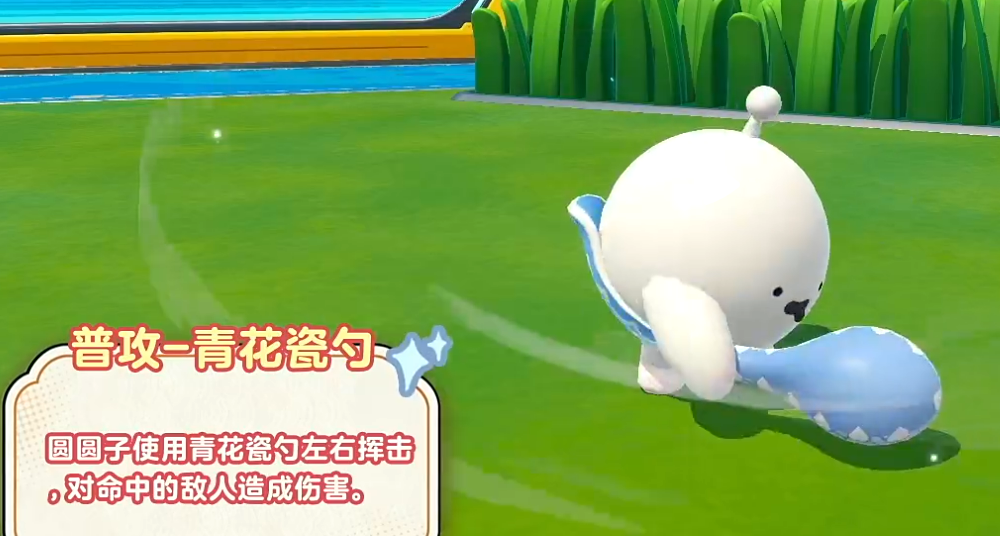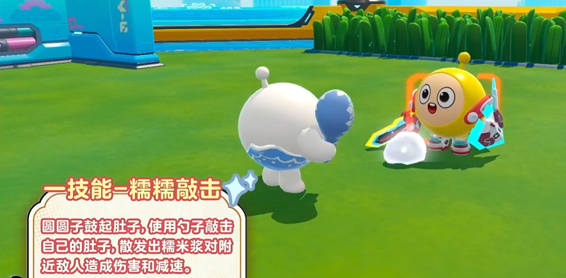 普攻是青花瓷勺,左右挥击对附近敌人造成伤害。没什么特别复杂的操作,就是基础的近身攻击,适合在技能冷却的时候补刀用。一技能叫糯糯敲击。圆圆子会鼓起肚子,然后用勺子敲自己的肚子,把糯米浆震散出去,对附近的敌人造成伤害和减速。这个技能主要用来控制对方的移动,对手被减速之后走不快,后续连招就更容易打到了。近身战的时候先放这个,对方跑不掉,后续输出更稳。