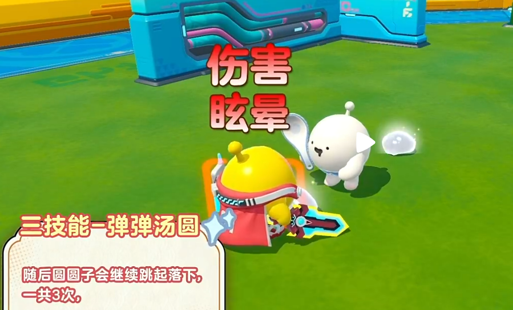 三技能叫弹弹汤圆,这个技能是圆圆子最核心的输出和控制手段。圆圆子会跳起来落到目标位置,第一次落地会对范围内的敌人造成眩晕和伤害。眩晕期间对方完全动不了,是很好的连招窗口。落地之后圆圆子不会停,会继续跳起来再落下,一共三次。第二次和第三次落地不再眩晕,但会造成伤害和减速。而且这三次跳跃期间可以改变方向,不是直线固定路径,可以根据场上情况调整落点,灵活性比较高。