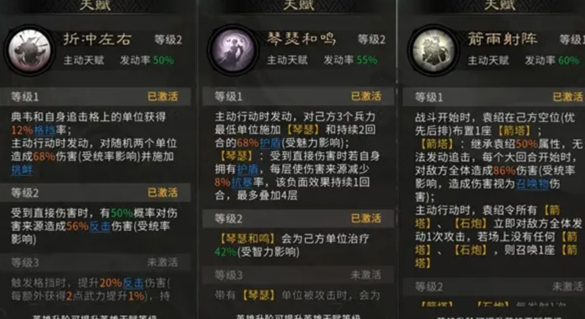 典韦主动携带【历战之躯】、被动【一夫当关】,提高前排坦度、控制敌方攻击方向。小乔的主动、被动技能都带【厉兵秣马】,给自身和追击格单位提供护盾和伤害减免,使穿杨军可以输出。袁绍推荐携带【深仁厚泽】,回血的同时可以提高自身的统率属性,分担敌方的输出,使用【一夫当关】增加防御。各个特色明显的技巧组合起来就是一套完整的战术系统,保证了队伍一直处在稳定高效的运转之中。