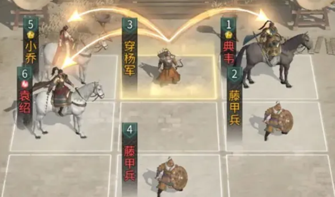 典韦一般放在右上最前面,是主坦,保证前排稳定和生存。他的天赋【折冲左右】可以给追击格上的单位提供格挡,随机挑衅两名敌方单位,为穿杨军创造输出环境。小乔、袁绍在穿杨军后方,起辅助、分担输出的作用,小乔的【琴瑟和鸣】可以给穿杨军的兵力最低的三个单位提供护盾和伤害减免,大大提高了生存能力,也保证了穿杨军的持续输出,使整个阵容更加均衡。
