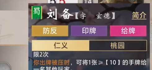 使用仁义的时候要考虑到技能次数和限制,每局最多可以发动两次,转移牌的点数不能大于10点。手牌过此点数之后就无法通过技能传递,玩家要事先安排好手牌和技能的顺序。除此之外,在刘备被动技能中,桃园是仁义消耗完毕第一次才触发的,玩家拿到的非废王手牌数是3张,则它的续航、抗压能力都会提高,从而可以持久支援队伍,关键时刻掌握主动。