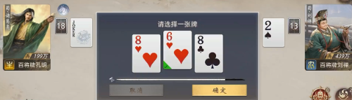 实战中鲁肃既可以为自己取得关键牌,又可以影响敌方手牌的分布。玩家使用豪富技能的时候要权衡选择,既要保证高点数牌或者重要的组合落在自己的手里,又不能给敌人留下形成炸弹或者顺子组合的机会。因此,鲁肃在三国百将牌中既是辅助人物,又是关键人物,在关键回合里可以扭转局势,在敌方即将出完手牌的时候,通过补牌干扰其收尾,达到逆转的效果。