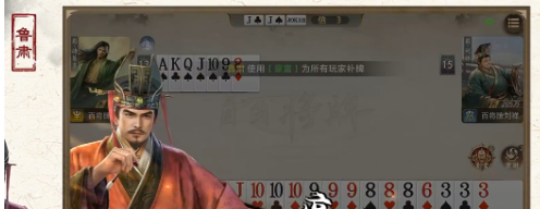 操作技巧上应该按照对局环境选择技能释放的时间。主动进攻时留出关键点数或者同点数牌,用【豪富】准确补齐手牌,形成炸弹或者高点组合;防守时注意对手出牌情况,先挑对己方有利的底牌,把零散的小牌留给对手,创造出手牌结构上的优势。另外,在决战残局的时候,鲁肃的技能可以成为重要的翻盘点,用补牌干扰敌人的收尾,延缓敌人的出牌速度,给己方争取机会。