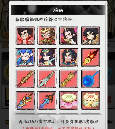 抽取宝珠累积次数,还能额外触发“赐福”,必得随机的高品质的神兵、坐骑或皮肤;此外,累计触发3次“赐福”,必得一件随机高品质皮肤。