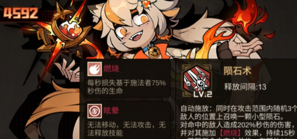 搭配天罚的被动技能,就可以把爆发拉到极致,而它的自动技能冷却时间是比较短的,可以穿透多个敌人。在打持续性伤害时,还可以配合队友的技能联动,副C就应该选择维维安。这就是一个阵容粘合剂,被动可以缩减自动冷却技能,自动技能陨石术,还可以给敌人挂一个将近15秒的燃烧。每一段都可以触发天罚的增伤,还有自身的冷却,所以越是攻击,那技能放的也就会更加的频繁。