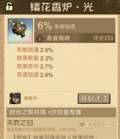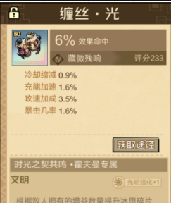 霍夫曼的专属遗物是缠丝光,这一个就会拥有6%的命中效果搭配冷却缩减,攻速加成,还有充能加速等一系列副词条。就可以有效满足作为前排控制,还有承伤的定位,它的专属文明就是时光之契共鸣可以直接激活天罚之日,可以迅速的提升暴击伤害,让霍夫曼在控制敌人的同时,还可以打出一个不错的输出。另外一位冰系前排瑞德则主要是以巨髓宝珠作为专属。
