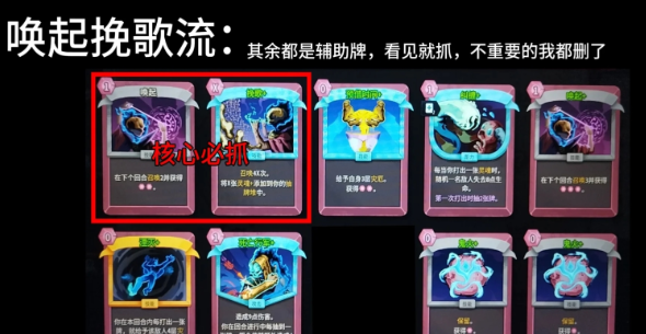 1、唤起挽歌流:核心牌少,但是要前期就抓出来,不然很难打,只要抓出来就一直走商店消牌