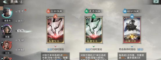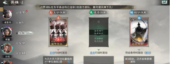但是选择了这三种人物角色之后,还需要合理排兵布阵,正确放置在合适的位置上,才能将抗击打能力以及抗伤害能力发挥到极致,就比如诸葛亮需要放在最前排,另外两位人物角色就要站在诸葛亮的身后,能够将孙权的天赋技能发挥出来,在不同的战场模式当中,都可给自己的队友造成四维的属性加成。其次,就算自己的队友遭受到敌人的攻击时,也会有很大的几率可以快速恢复兵力。其实此阵营当中不得不承认郭嘉的天赋也是非常出色的,善于和敌方阵营斗智斗勇,来一场智力比拼。