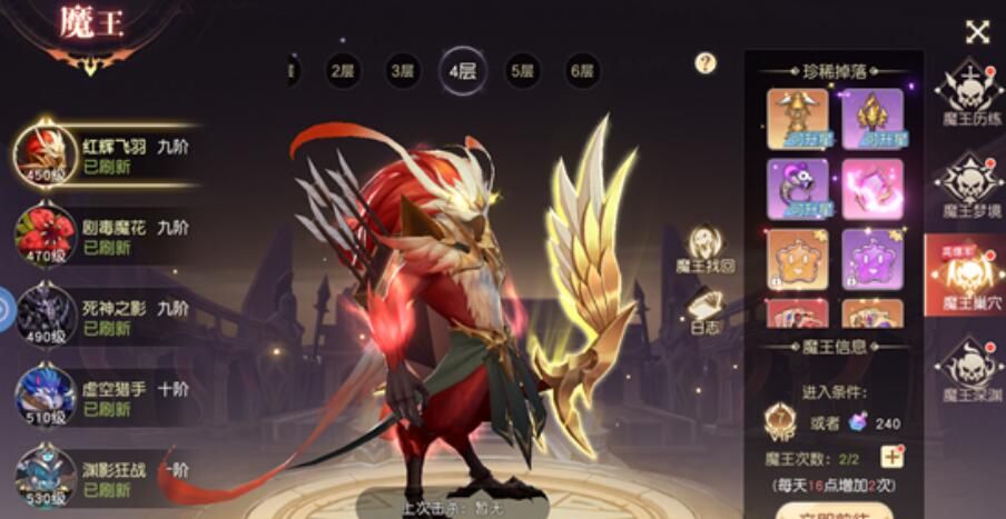 最后玩家需要做的就是每天的魔王Boss是玩家必须要挑战的,由于在魔王系统当中。每天有两次免费挑战的机会,玩家在这样的情况下,千万不要去浪费,因为在这里可以掉落强化石,这样对玩家提升战斗力会有比较好的效果。也有部分玩家在游戏初期的时候出现了卡关的情况,此时主打的就是战斗力没有达标,那么玩家可以提高战斗力。