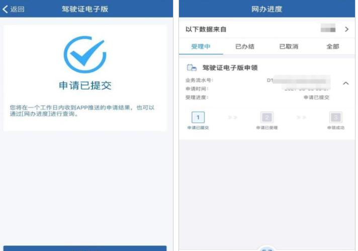 第四步:提交驾驶人电子照片后,您将在一个工作日内收到APP推送的申请结果,也可以通过【网办进度】查询当前业务办理进度。