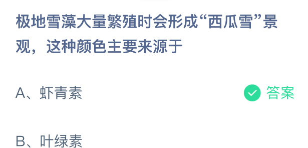 极地雪藻大量繁殖时会形成“西瓜雪”景观,这种颜色主要来源于?支付宝小鸡课堂开课啦!每天花一分钟正确答题就能获得180饲料,喂喂小鸡就能贡献爱心啦!轻松又意义十足!2026年3月17日蚂蚁庄园的小鸡课堂题目正确答案是【虾青素】,极地雪藻大量繁殖时会形成“西瓜雪”景观,这种颜色主要来源于虾青素。