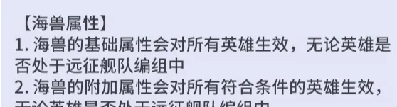 海兽系统的每只海兽所拥有的基础&附加属性都能给所有部队相应加成,而且这个属性是在任何战斗场景都生效的,比如闯关,世界海战,竞技场等等,所有地方海兽的属性都生效。