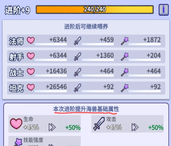 进阶这个模组实际上用处不大,因为给的属性太少了,升到12阶加的属性也就几万血、几千攻击,还不如升1级英雄加的属性多,并且每次进阶时加的百分比其实是给升级页面的海兽基础属性加的,而不是给英雄加百分比,所以实际加的属性很少,只能说聊胜于无了,有多的材料可以升,没必要特意升。