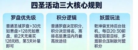 1、四圣活动核心产出为珍稀红内丹及内丹相关道具,未开放内丹的新区建议少氪,本期活动叠加累充福利,氪前先看优先级。