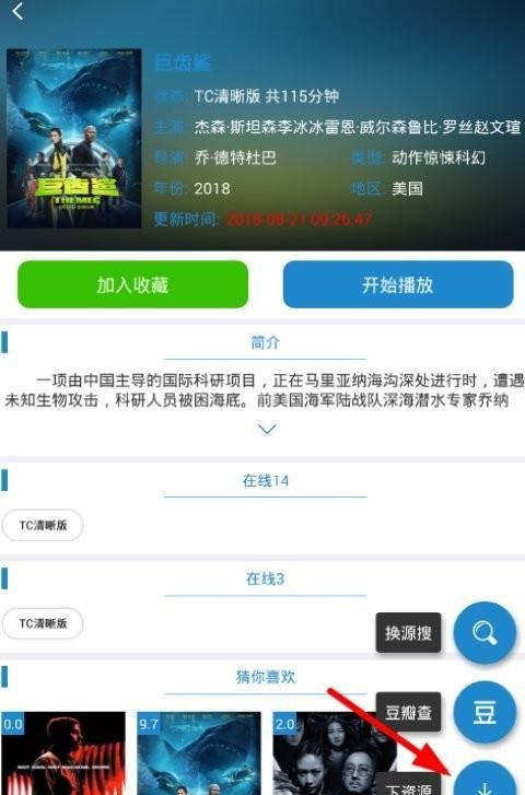2、从视频详情页面的右下角点击“+”按钮,就可以选择“下资源”功能,从而搜索查找该电影的资源了。