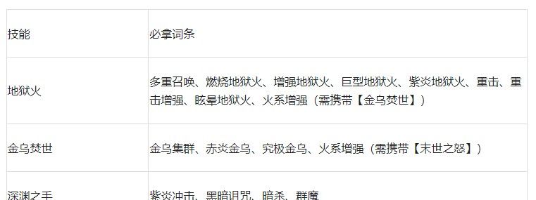 搭配说明:【地狱火】在发动时能召唤地狱火与玩家协同攻击,且地狱火的持续时长远久于技能的冷却时间,所以可一直在场上输出,再加上还有【金乌焚世】、【末世之怒】这两个火系技能的配合,可将敌人卷入火焰海洋令它们焚灭。【深渊之手】作用是禁锢敌人,完成控场。