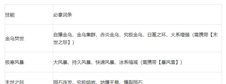 搭配说明:【金乌焚世】首充即可获得,技能使用时覆盖范围可观,搭配【金乌集群】增加金乌数量后,几乎能覆盖近半屏,再结合【极寒风暴】的冰冻效果,能显著提高推关效率。【末世之怒】、【暴风雪】除了能为玩家补足伤害外,也是激活【火系增强】和【冰系缩减】的必要挂件。