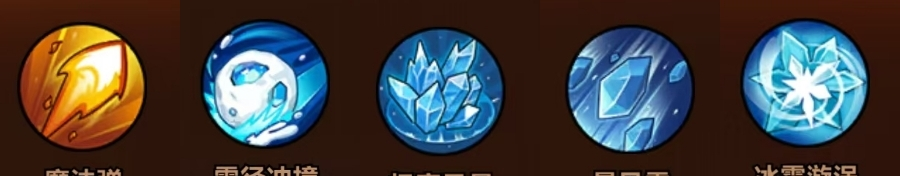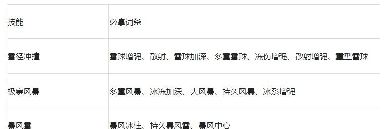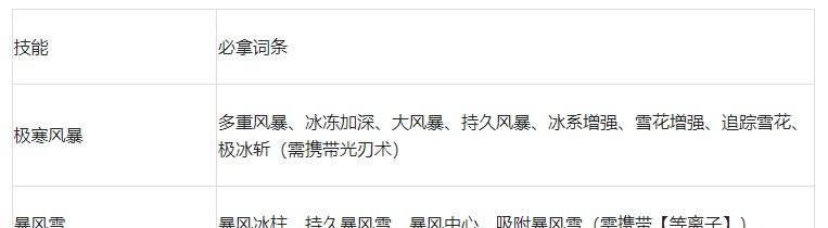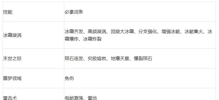 注:此流派是零氪玩家、首充玩家、月卡玩家首选的冰系毕业体系,最好在【极寒风暴】升到2级后再使用,这样效果会更好,且【极寒风暴】的等级越高,此流派的dps也越高。若玩家已经解锁了【光刃术】,可用它来替换【冰霜漩涡】,同时词条必拿【极冰斩】。