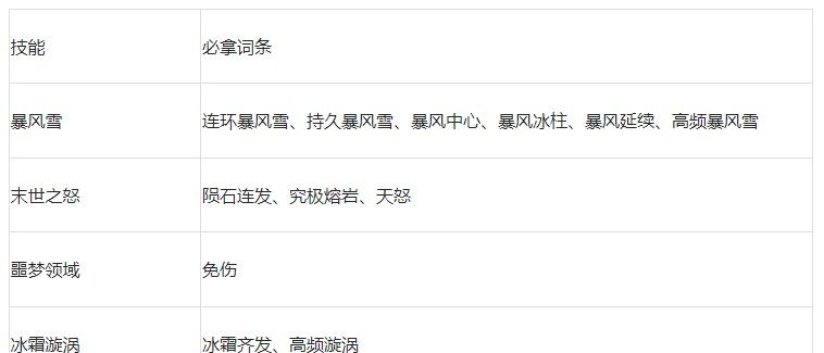 搭配说明:【暴风雪】技能范围较大,还具备着能让敌人减速的能力,拿了【暴风延续】词条后还有概率能冻住敌人,因此用它来作为新手时期的主技能会令玩家很安逸。【冰霜漩涡】、【末世之怒】以补足伤害为主,不需要拿太多的词条,【噩梦领域】拿免伤来确保续航即可。此流派适合已经将【暴风雪】升至2级的玩家。