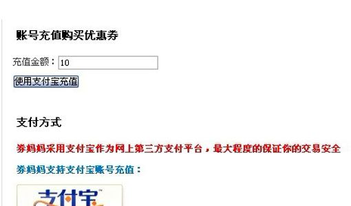 到券妈妈的“账号充值”页面输入要充值的金额, 然后点击“使用支付宝充值”去支付宝充值