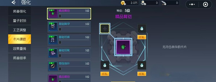 第二个适用于新人的提升内容是卡片镶嵌,是玩家在装备中通过高级资源卡片镶嵌,来进行卡牌升级以及附属攻击属性的加持,按照玩家们的个人需求进行对应装备的等级提升,而这一模式则可提升战力的整体平衡性,不过需要提醒玩家的是,在选择卡片镶嵌后,不可以对其进行随意拆卸,常常需要玩家找到抽生取卡机这一高级装备,所以在卡片放置过程当中一定要谨慎操作。