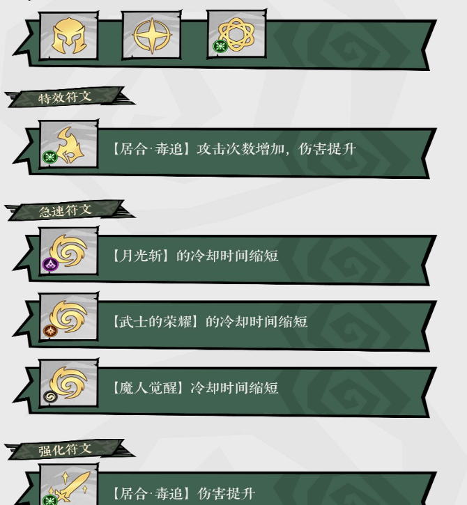 构筑策略分阶段推进:前期采用中毒六件套快速成型;中后期保留毒系两件套以强化“居合·毒追”的基础伤害,并混搭毒刀专属两件套与其他高伤散件。技能配置上,“居合·毒追”为绝对核心,具备超广范围与高触发频率;太刀类技能CD短于法师,但蓝耗显著上升,因此需通过被动技能进一步提升居合伤害并降低1技能能耗。主宰技前期选用“裂霜延斩”施加易伤,后期替换为“风行者”提升机动与连击效率;守护技推荐点出奥义,显著增强整体输出循环效率。