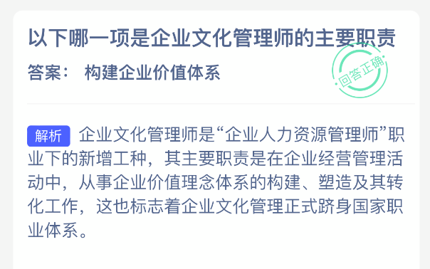 以上就是以下哪一项是企业文化管理师的主要职责?支付宝蚂蚁新村最新答案2025年12月7日,更多精彩内容,请点击关注更新!