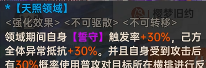 天照领域这个强化效果让天照命的防守反击能力大幅提升。领域期间自己的誓守触发率增加30%,全队异常抵抗也提高了。更厉害的是受到攻击后有30%概率用普攻反击目标所在的横排,这就让他变成了一个反击型角色。敌人越是集火他,他的反击次数就越多,配合普攻的童子切和蜘蛛切效果,能打出不错的输出。