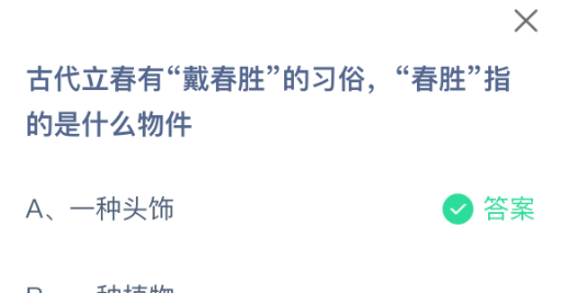 古代立春有“戴春胜”的习俗,“春胜”指的是什么物件?支付宝小鸡课堂开课啦!每天花一分钟答题赚饲料,喂喂小鸡就能贡献爱心啦!轻松又意义十足!2026年2月4日蚂蚁庄园的小鸡课堂题目正确答案是【一种头饰】,古代立春有“戴春胜”的习俗,“春胜”指的是一种头饰。