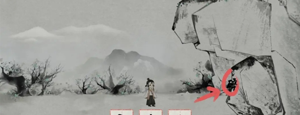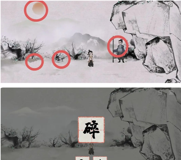 1、第一关中,主角在蝴蝶指引下进入山洞,向右行进并与驻守士兵对话,收集士兵形象和旁边石块,分别获得“卒”字与“石”字,组合生成“碎”字,应用于石块。