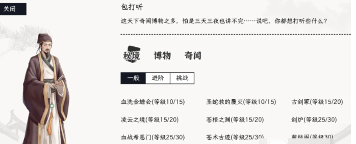 想要顺利进入到秘境大家首先需要得到一个信物,而信物获取有两种方法,一个是打败游戏选择的精英级别的BOSS,再有就是来到侠义时间当中,选择一个事件触发然后拾取。将信物给包打听,在该游戏中秘境分为十一个等级。