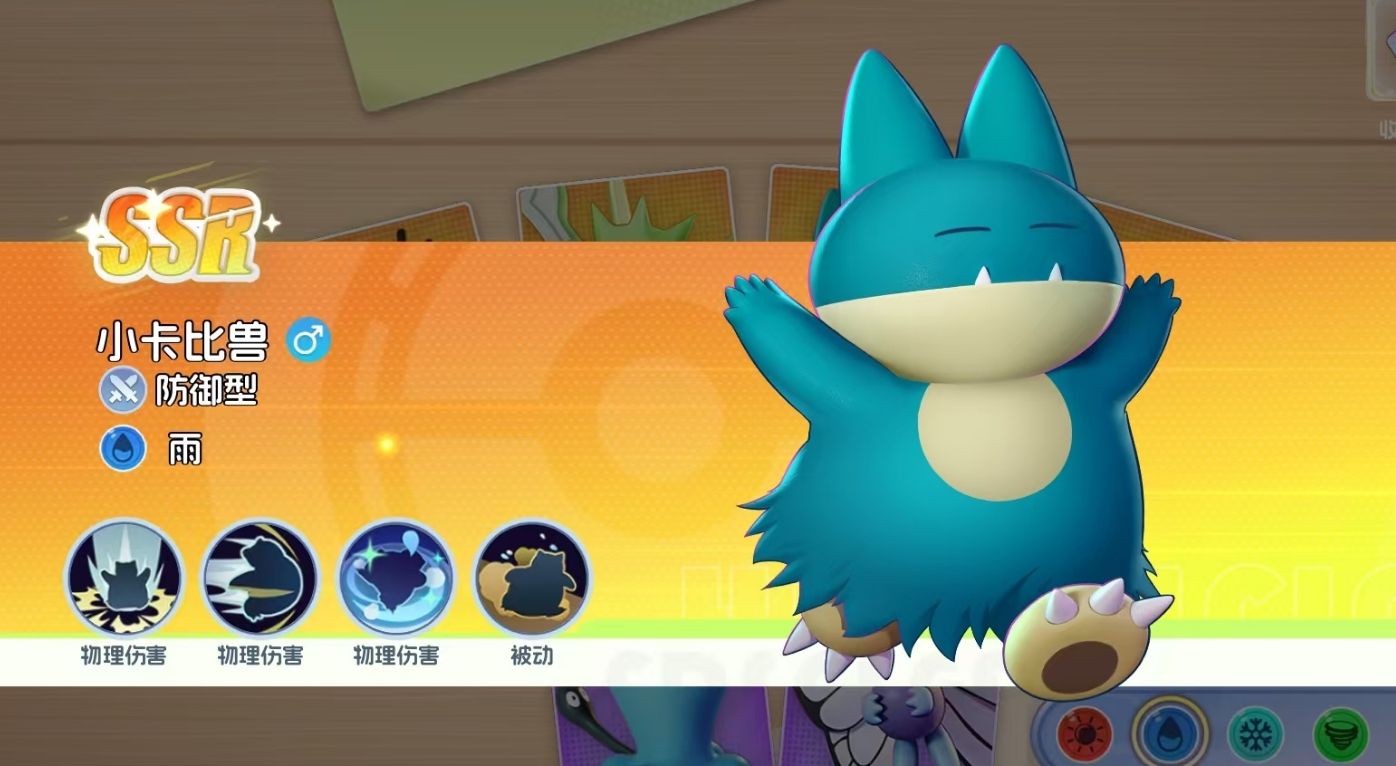 同样是初始就能获得的宝可梦,开启大招后自带减伤,且能对周边敌人造成攻击的同时,还能持续地嘲讽住敌人,更能通过瞌睡效果来降低敌人的闪避和攻击速度,是拥有控制能力的防御型宝可梦。11级时解锁的重磅重撞还附带基于最大生命值的额外伤害,令它也拥有着极强的输出能力。
