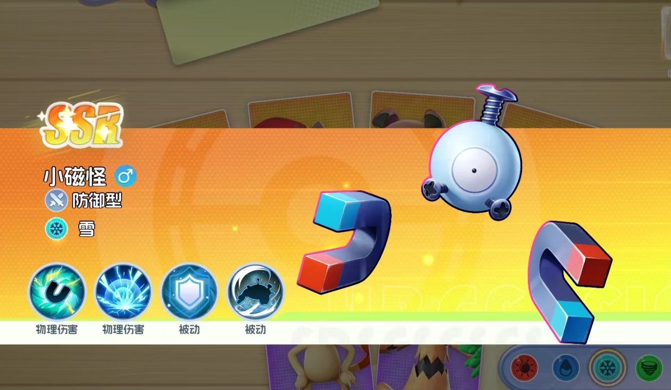 与炭小侍一样都是控场能力很出色的宝可梦,它可通过释放电磁场,让电磁场内的友军享受到法术伤害减免25%的效果,还能持续对范围内的敌人施加麻痹,叠满5层时敌人会陷入无法动弹的负面效果。同时,作为防御型宝可梦,小磁怪在受到攻击时,还有20%的概率格挡本次攻击20%的伤害。