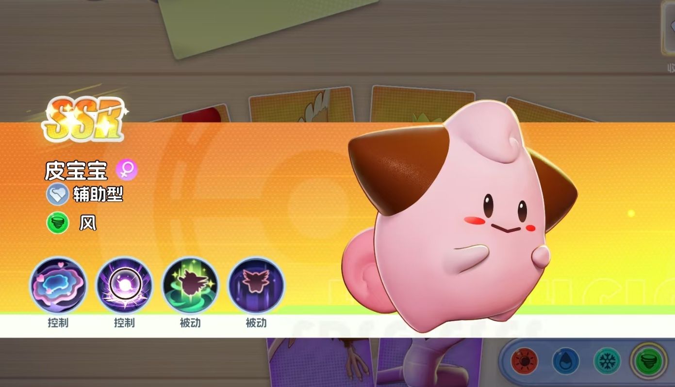 皮宝宝同样是辅助型宝可梦中非常好用的存在,它可主动锁定敌方宝可梦较多的区域释放大招,让大招范围内的敌人陷入着迷状态,配合11级技能月亮之力,能控住敌人非常久的时间。而且皮宝宝每次释放完技能后,还可为全体友方宝可梦回复生命,被动更是能直接无成本的降低敌方闪避数值。