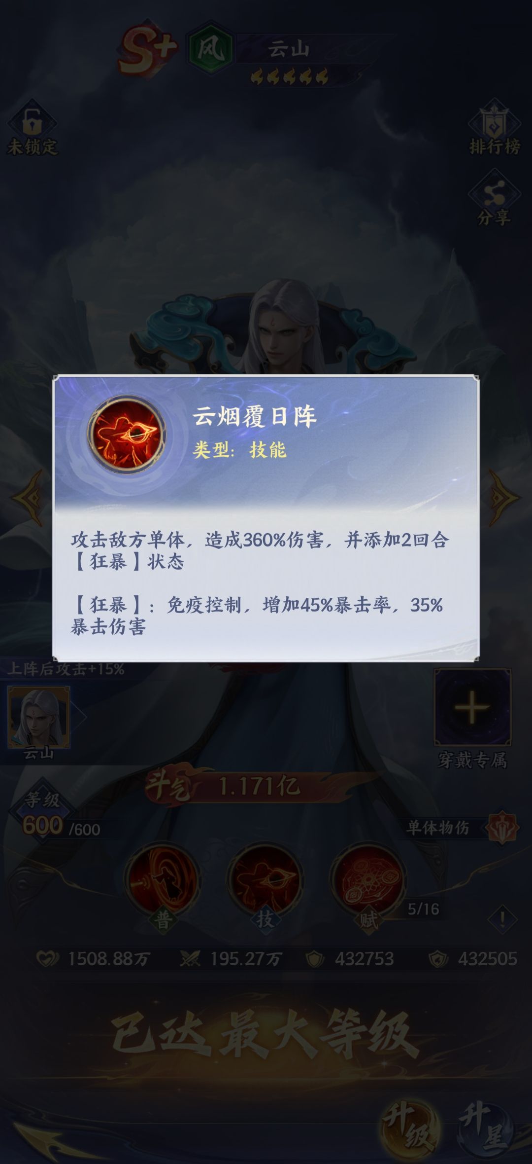 核心技能云烟覆日阵就成为他力量的一大体现,不仅可以针对单体造成360%的高额伤害,还可以给自己施加两个回合的狂暴状态。在免疫控制的同时,还能有效提升45%的暴击率,另外还可以提升30%的暴击伤害,让每一次的攻击都是特别可怕的。他的一生其实就是一场悲剧,曾经是守护者,可是在力量的诱惑之下,居然亲手摧毁整个宗门。而他是一个强大的角色,可是最终的悲剧也让人觉得有一些唏嘘,如果大家想要去体验一下,那也可以关注上面的内容。