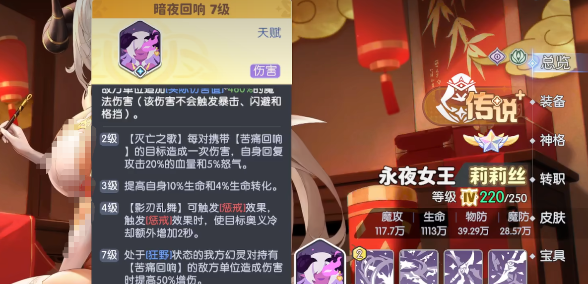 特技梦魇掠夺让莉莉丝在挂上苦痛回响的同时,还能偷取目标2.4%的攻击力,持续8秒可以叠5层。虽然对Boss无效,但在打其他内容的时候,这个属性偷取能让她越打越强。神格技能影刃狂舞,则是给影刃乱舞增加了攻击降低和暴击降低的debuff效果,进一步削弱敌方战斗力。
