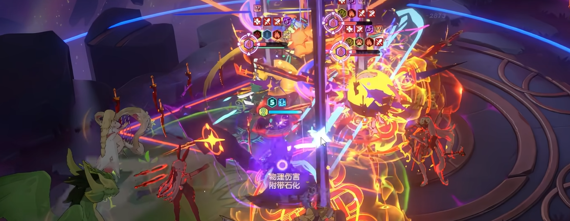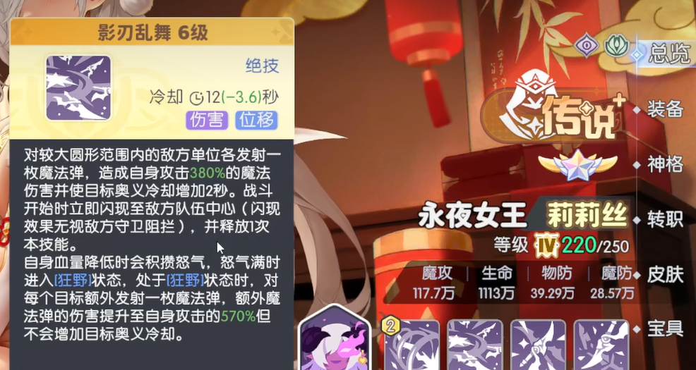 绝技影刃乱舞的机制稍微复杂一点。战斗一开始,莉莉丝就会闪现到敌方队伍中心,这个闪现还能无视守卫的阻拦,然后立刻释放一次影刃乱舞。这个技能会对范围内,每个敌人发射魔法弹,造成攻击力280%的伤害,同时增加目标2秒的奥义冷却时间。莉莉丝血量降低时会积攒怒气,怒气满了进入狂野状态后,影刃乱舞会对每个目标多发射一枚魔法弹,额外那枚的伤害提升到攻击力的420%,不过不会再增加奥义冷却了。