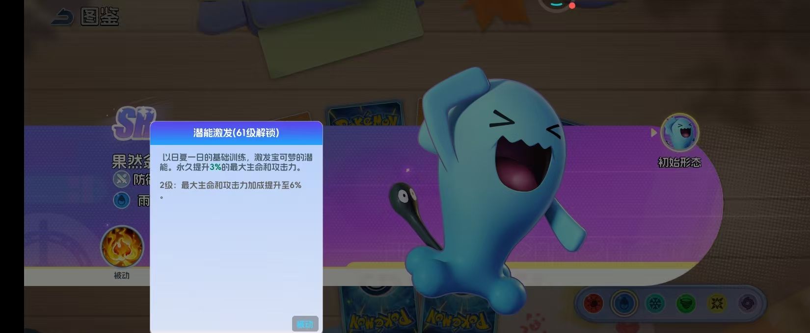 圆滚滚的蓝色身体,加上滑稽的黑色尾巴,就仿佛是一切的烦恼都和他没有关系。在这款游戏中,就会直接被定义为防御型的宝可梦,就可以精准的演绎出战斗的定位,他并不是一个冲锋陷阵的勇士,而是守护队友的坚盾。被动技能将这种反制的特性完全的发挥出来,所有打算强攻的对手,全部都需要三思而后行。在团队中,它的价值要远远的超过于面板上的防御数值,核心的魅力就在于反制,当对手准备倾泻火力将其打败之后,那他就可以把所有的伤害全部的返还。