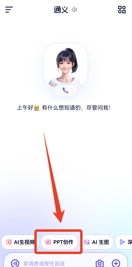 1、向右滑动输入框上面的功能,找到【PPT创作】。
