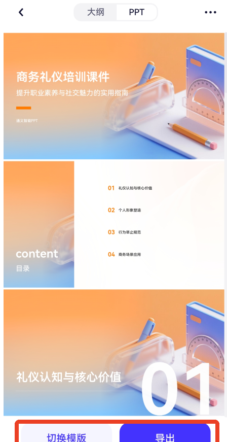 4、等待一会就会生成全部内容的PPT,你可以更换模板或者直接导出。